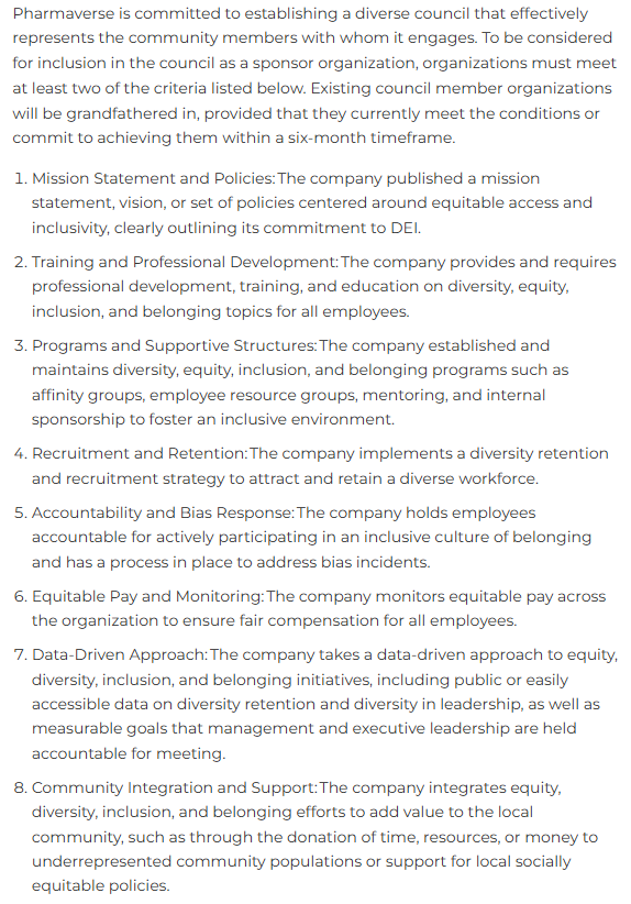 I am excited to announce that the pharmaverse council has approved additional organizational characteristics required for council membership. These criteria establish the level of DEI (Diversity, Equity & Inclusion) commitment we expect from council member organizations. This additional text is shown here and also linked: