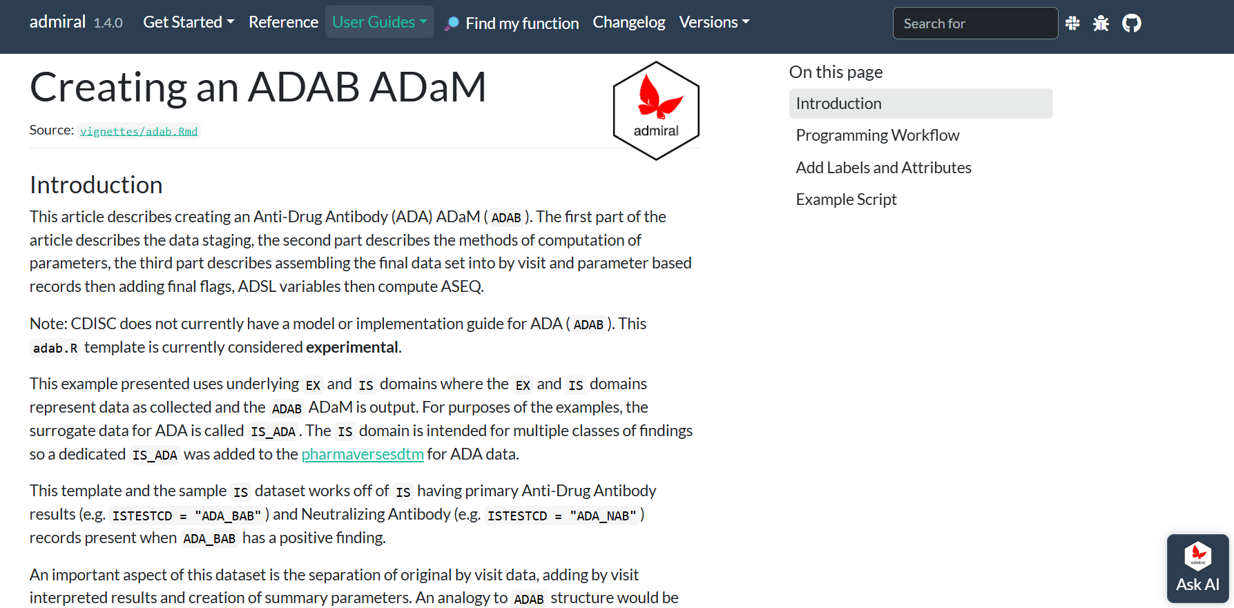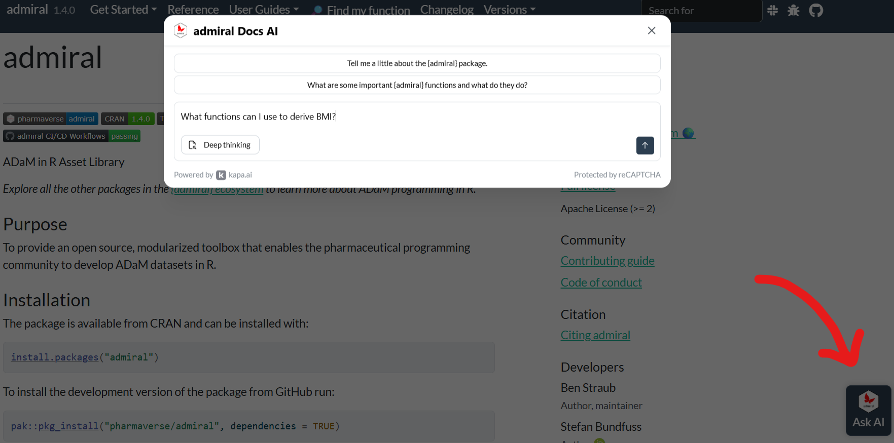 We are thrilled to announce that {admiral} has partnered with kapa.ai under their Open Source Program to introduce an AI-powered chatbot within every page of our website. This LLM chatbot is trained using the documentation pages of {admiral} and all our therapeutic area extension packages as well as the {pharmaversesdtm} and {pharmaverseadam} data packages and the ADaM IG. Indeed, look out for it to be added to every other package in the {admiral} ecosystem in their upcoming releases this month. To use the chatbot, simply click on the “Ask AI” button at the bottom right corner of any website page and start asking away - you may find that you get redirected to a User Guide, a function reference page or the website of another {admiral} package that you didn’t even know existed!