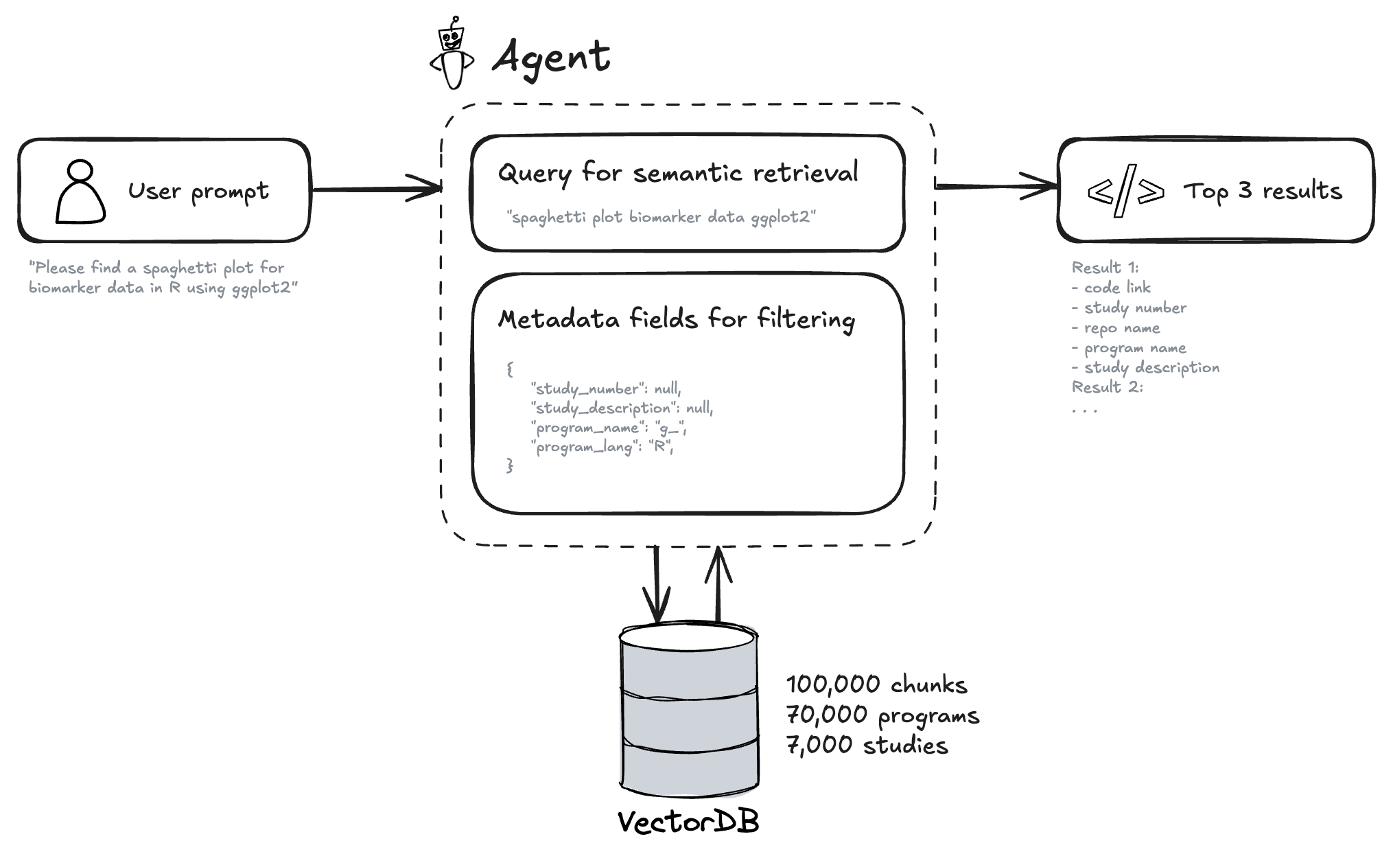 We perform a semantic search over the vector database and apply substring matching based on the metadata filters. Summaries help match intent (“derive AVALC from PARAMCD”) even if the snippet uses different variable names. The metadata filters help to narrow down the results to the most relevant snippets (e.g: adsl in the program name or phase III in the study description). Code on the ‘devel’ branch has generally been QC’d in our setup, which is a nice feature for code reuse.