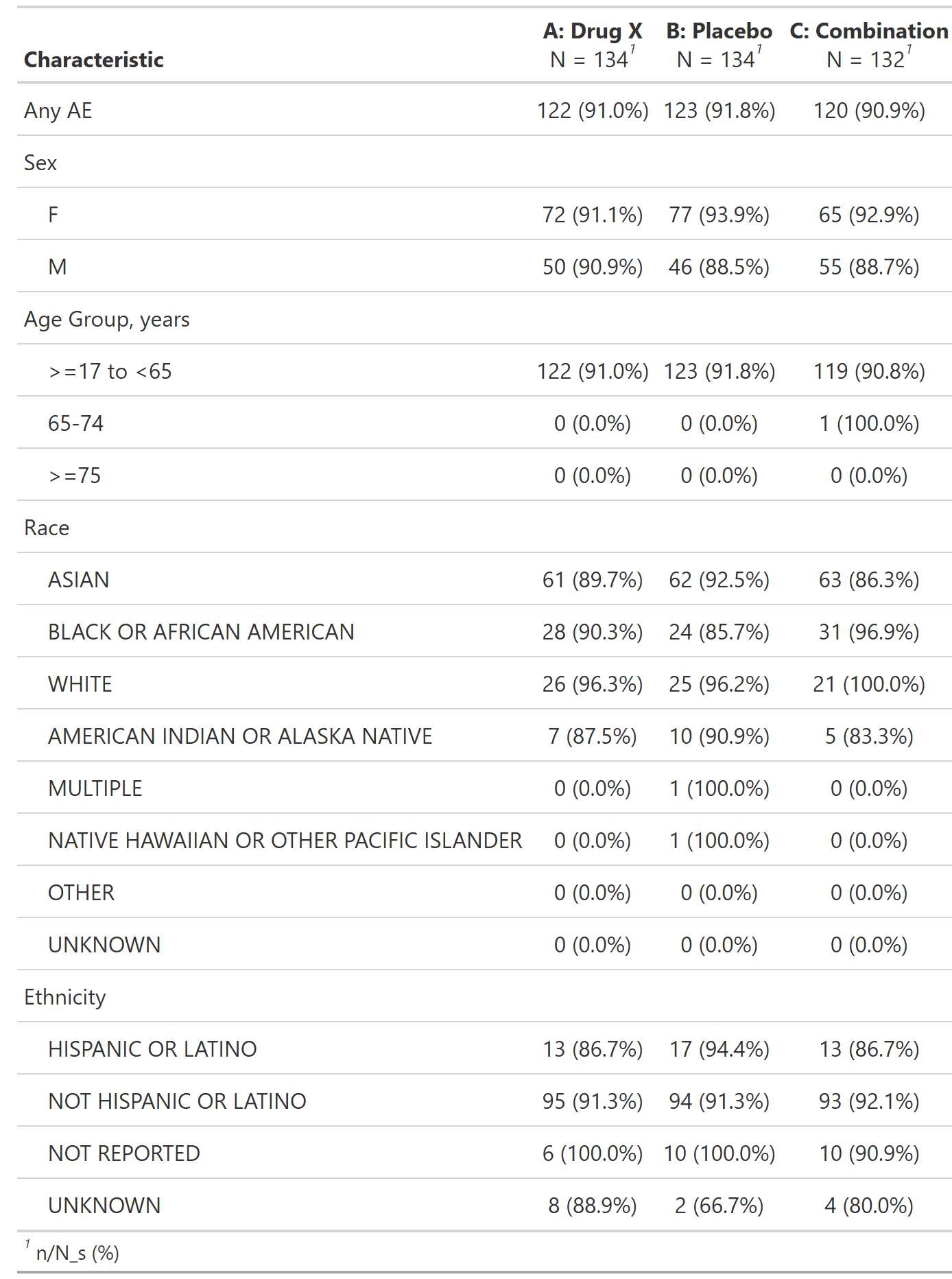 variables = c(any_ae, SEX, AGEGR1, RACE, ETHNIC),