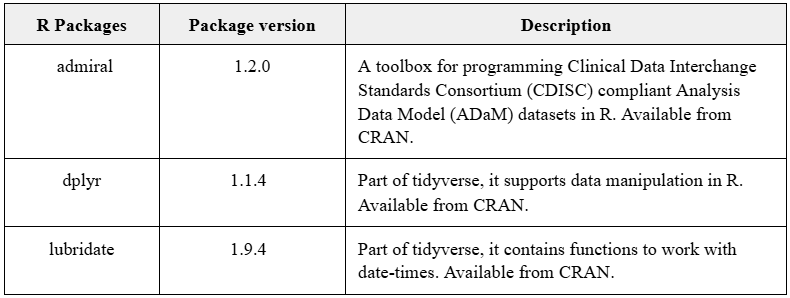 - Descriptions of the main open source R package used, the version of each that you used, and where these are available from (especially if anywhere other than CRAN)