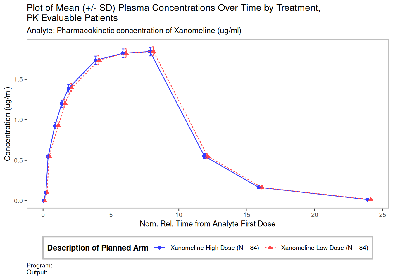 use_title <- "Plot of Mean (+/- SD) Plasma Concentrations Over Time by Treatment, \nPK Evaluable Patients"