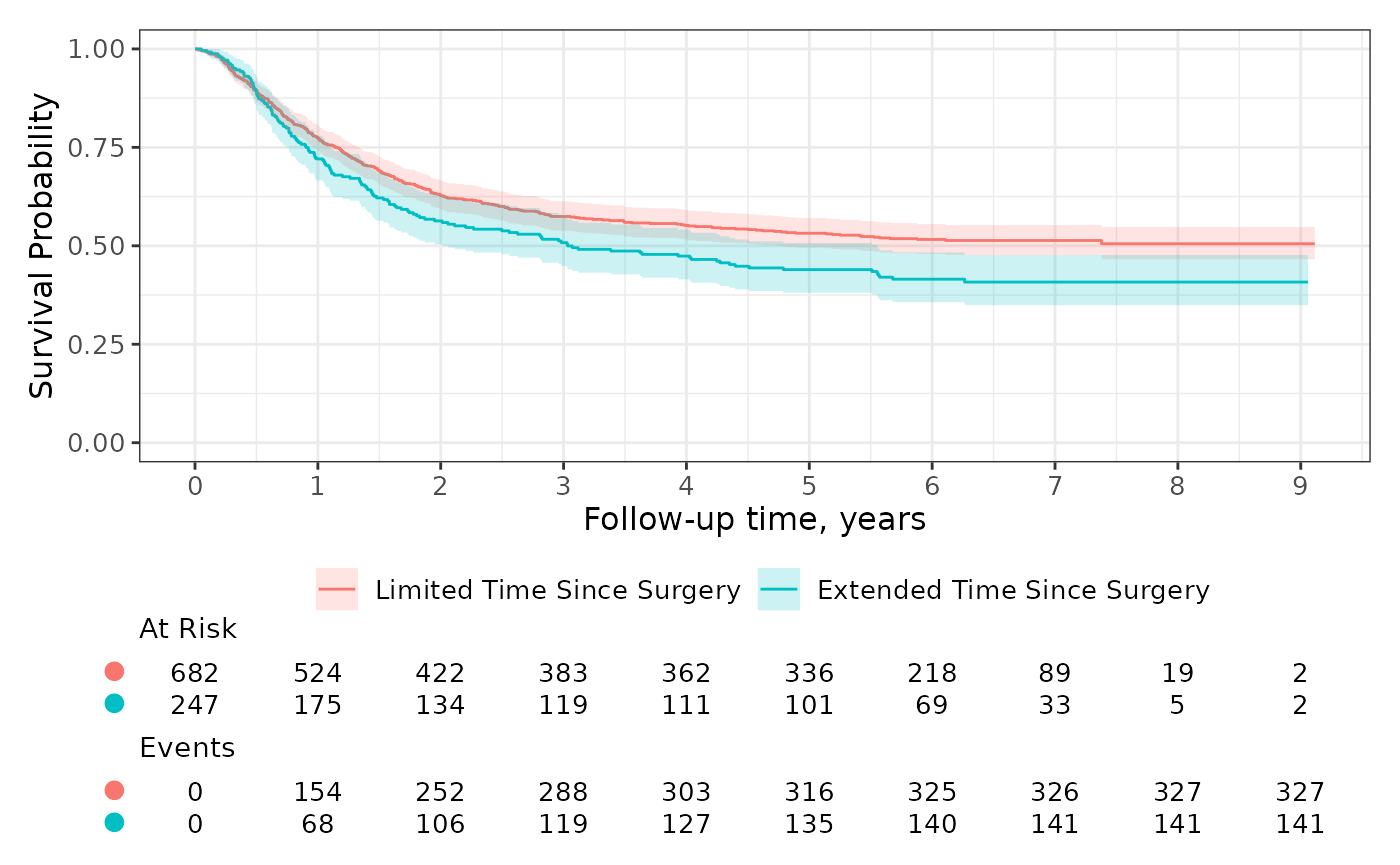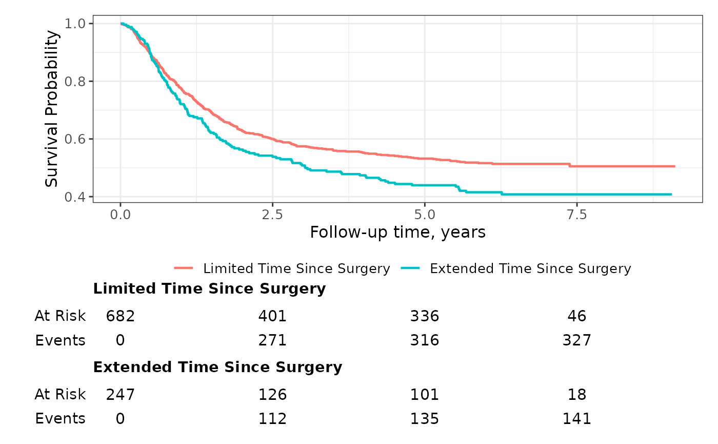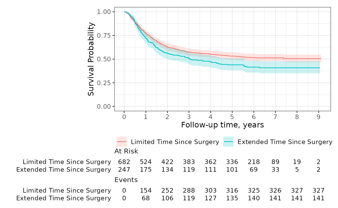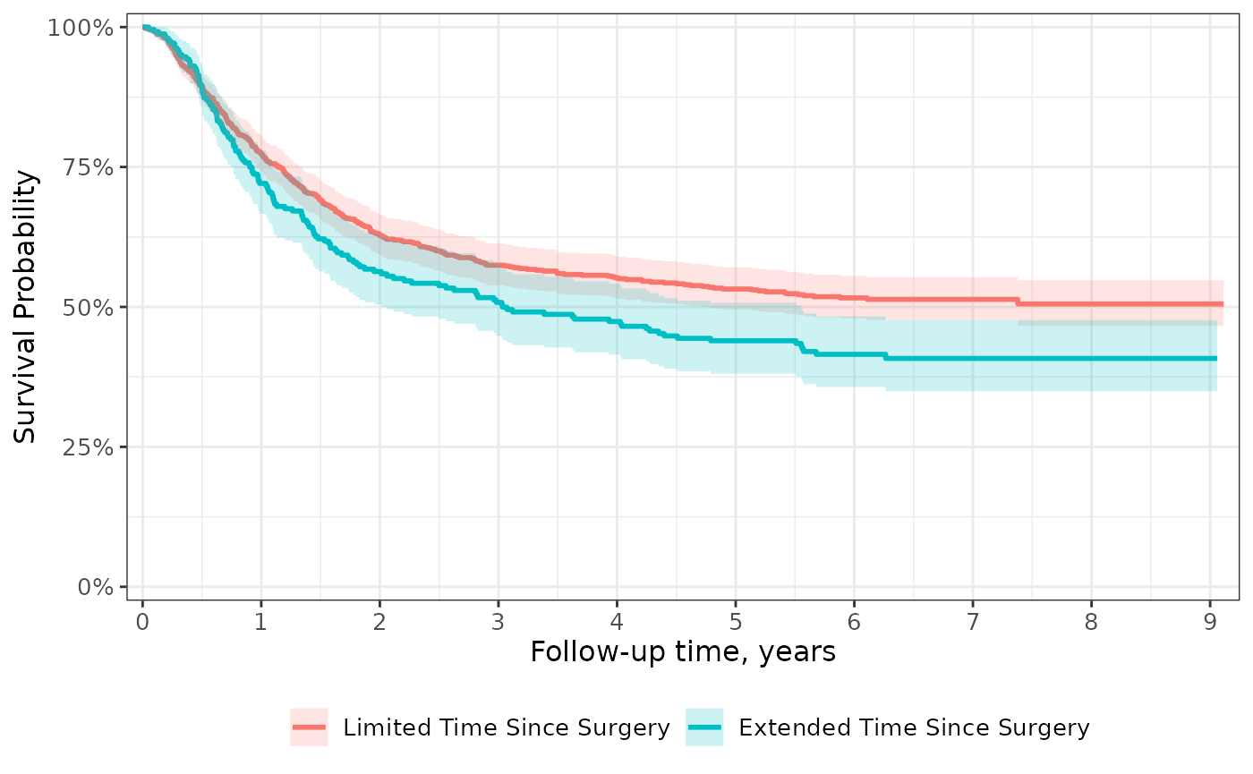 p <- survfit2(Surv(time, status) ~ surg, data = df_colon) %>%