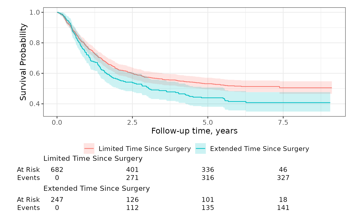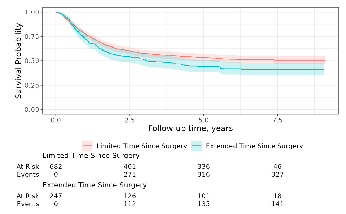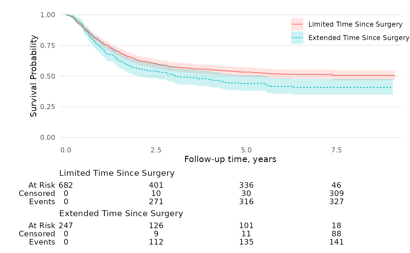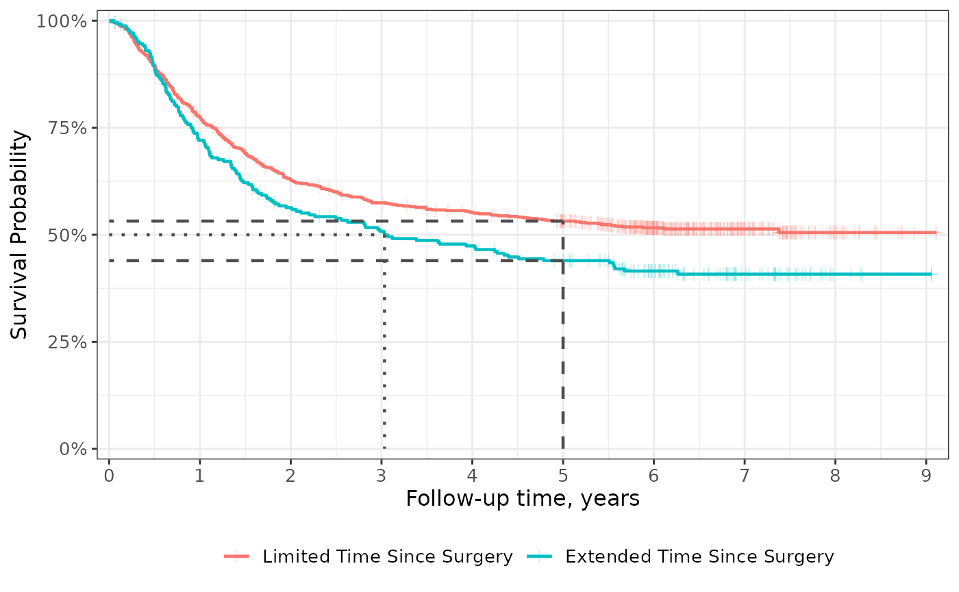 p <- survfit2(Surv(time, status) ~ surg, data = df_colon) %>%