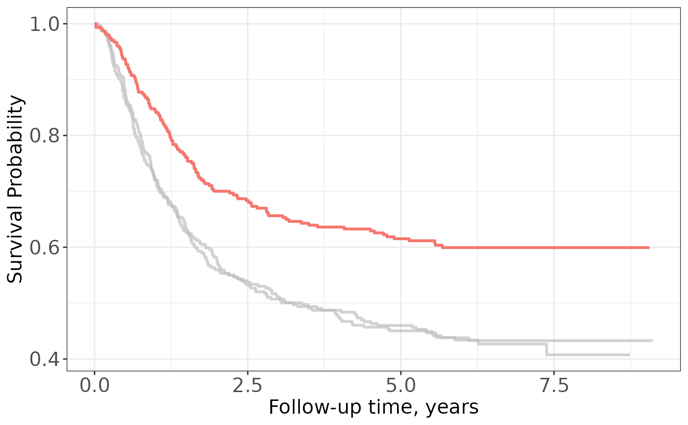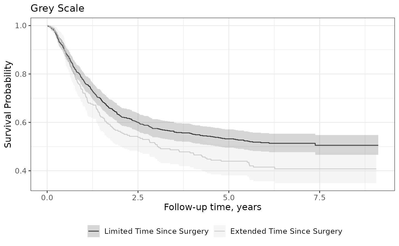 Because {ggsurvfit} functions are written as proper {ggplot2} geoms, you can both weave any {ggplot2} functions and ggplot2 extensions, such as {gghighlight} and {ggeasy}.