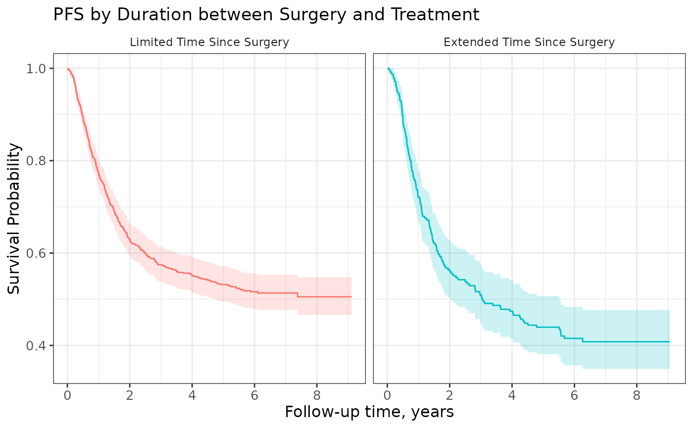 labs(title = "PFS by Duration between Surgery and Treatment")