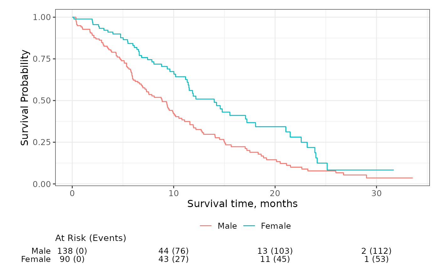 survfit2(Surv(time, status) ~ sex, data = df_lung) %>%