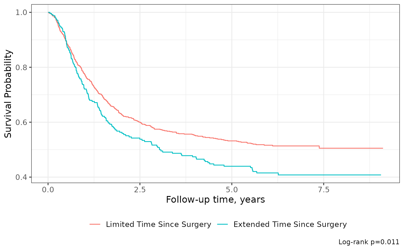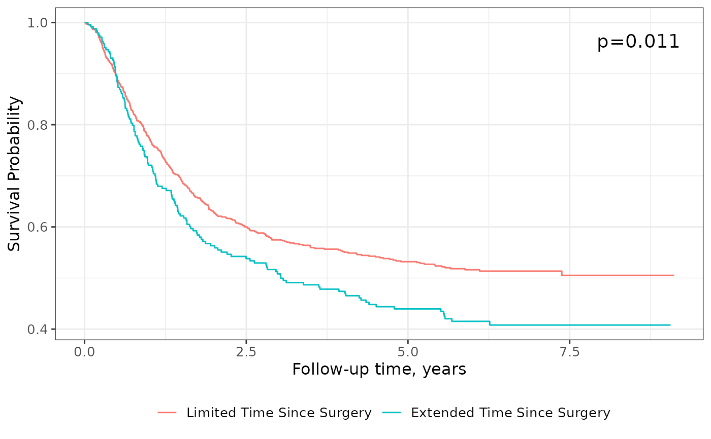 P-values are calculated with survival::survdiff() or tidycmprsk::glance().