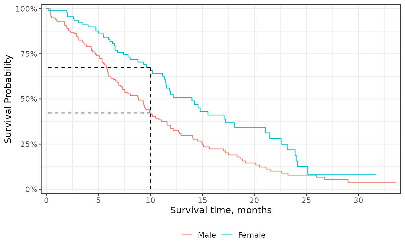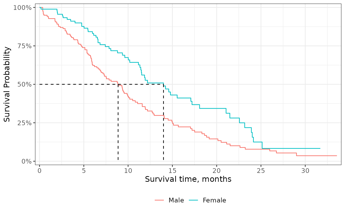 survfit2(Surv(time, status) ~ sex, data = df_lung) %>%